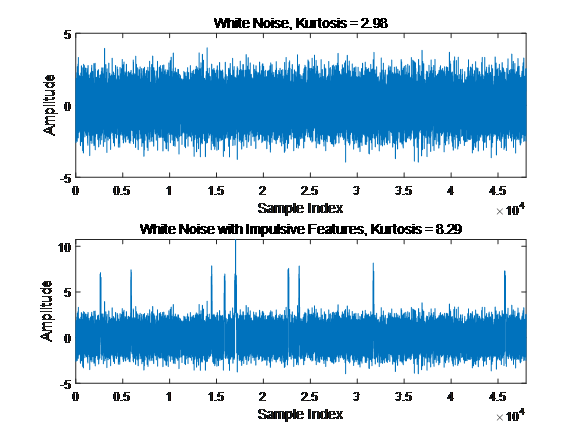 这样服从正态分布的数据的峰度值为0,因为正态分布的四阶中心矩与方差平方的比值恰好等于3。简单来说,峰度可以用来描述信号的非平稳特性,尤其是短时间内突发的噪声干扰,如果一段数据的峰度值越大,则表明该段数据中含有的突发性噪声干扰成分较多。下面以一段数据分析对比为例,采用信号仿真方法生成一组随机白噪声信号和一组添加有突发性冲击干扰的白噪声信号,分别计算两组信号的峰度值可以发现,含有突发性冲击特征干扰的白噪声信号的峰度值为8.29,明显大于不含有干扰的白噪声信号2.98。